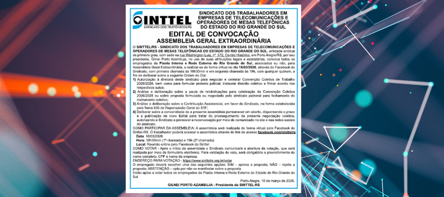 O SINTTEL-RS está convocando todos os trabalhadores e trabalhadoras da Planta Interna e Rede Externa no Rio Grande do Sul, associados ou não ao sindicato, para participarem da Assembleia Geral Extraordinária (AGE), a ser realizada dia 18 de março, de forma virtual, para tratar dos próximos passos da Campanha Salarial e da Convenção Coletiva de Trabalho (CCT) 2026/2028.